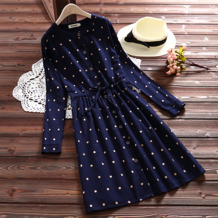 Polka Dot Print Drawstring Waist Long Sleeve Vintage Dresses