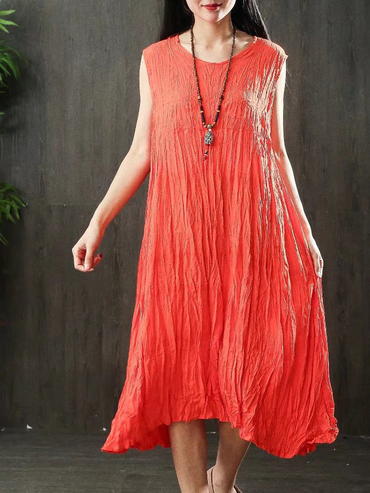 Pure Color Sleeveless O-neck Vintage Mid-Long Dresses