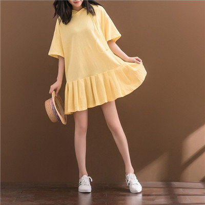 Solid Pleated Loose Hooded Half Sleeve Women Casual Dresses
