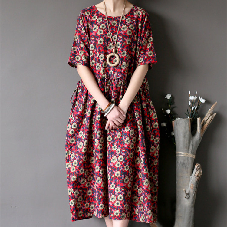 Vintage Casual Women Short Sleeve Floral Print Dresses