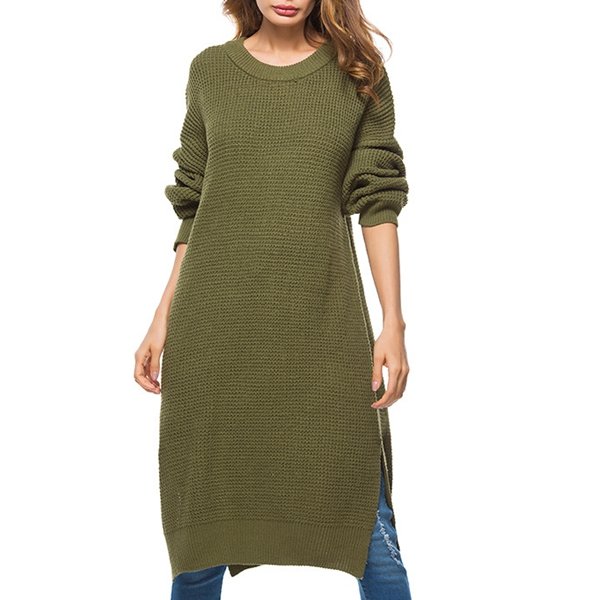 Casual Pure Color Side Splited Long Sleeve Women Sweater Dresses