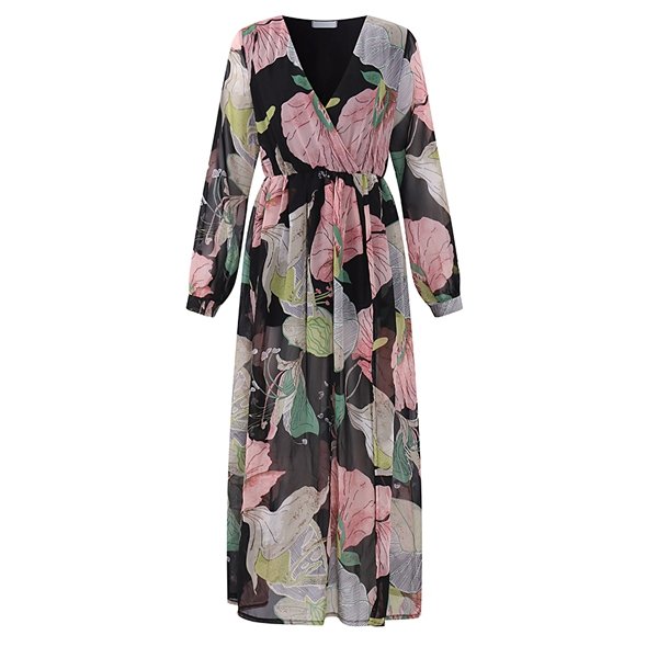 Bohemian Floral Print Splited Long Sleeve V-neck Women Maxi Dresses