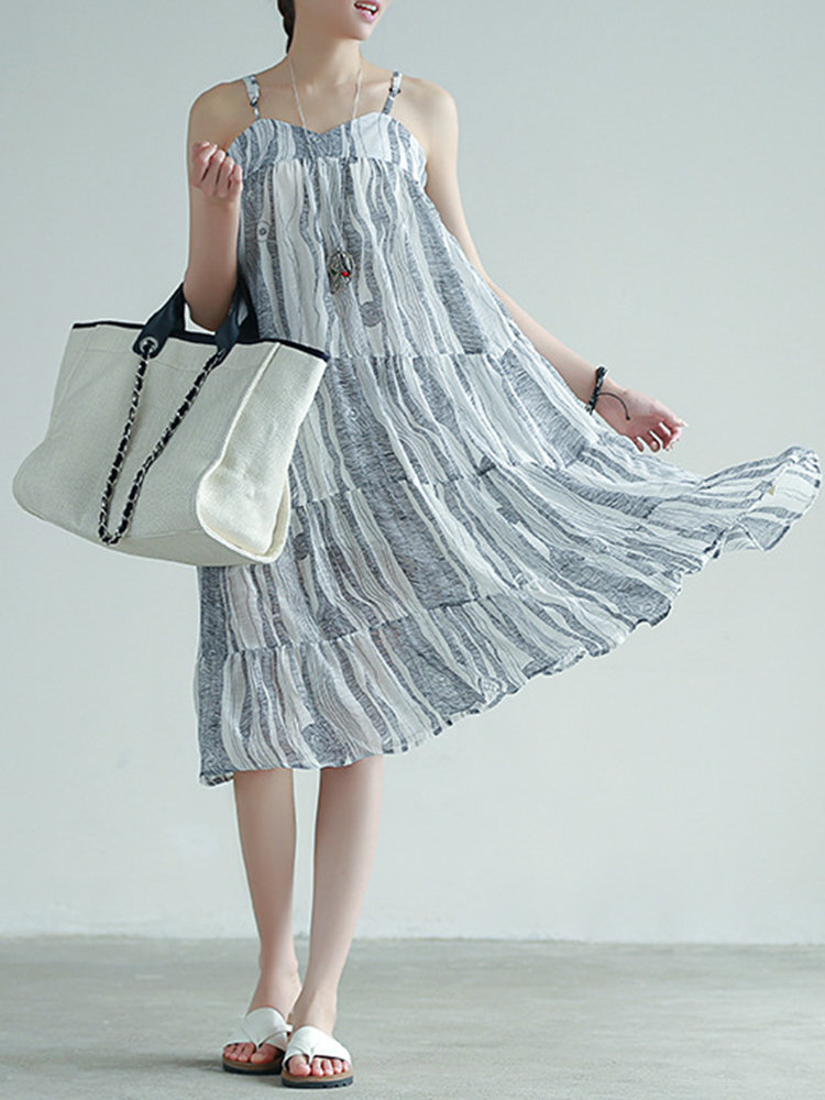 Stripe Patchwork Spaghetti Strap Vintage Mid-calf Dresses