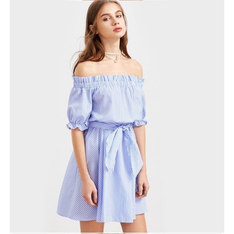 Stripe Off-shoulder Tie Half Sleeve Mini Dress For Women