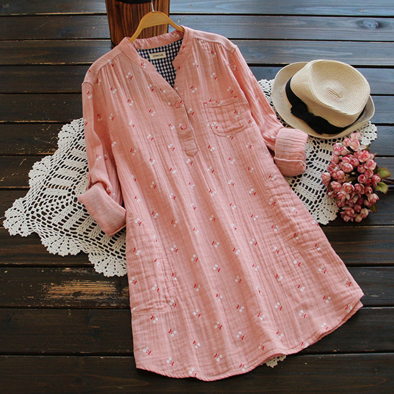 Vintage Printed V-Neck Long Short Sleeve Women Blouses