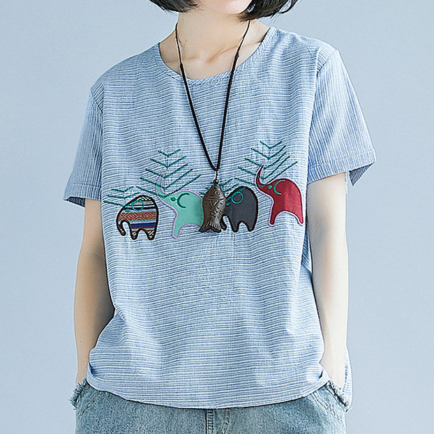 Stripe Elephant Embroidery Short Sleeve Casual T-shirts