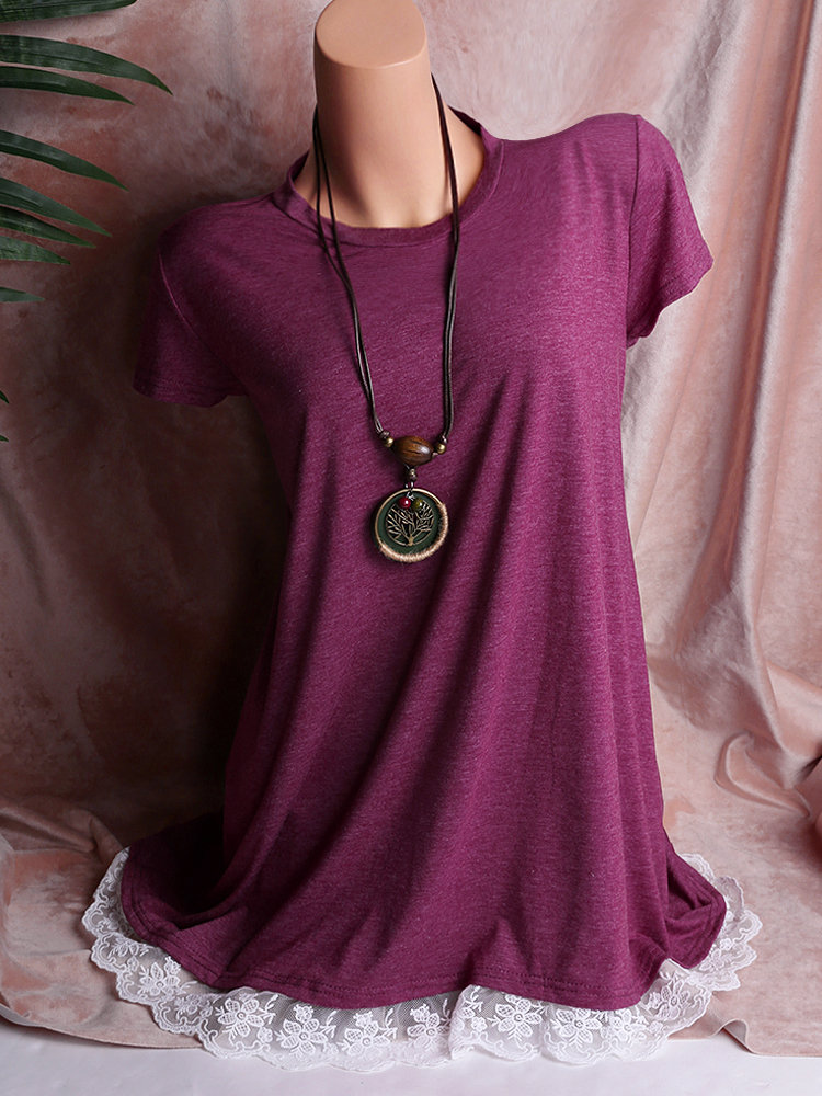 Lace Hem Short Sleeve O-neck Casual T-shirts