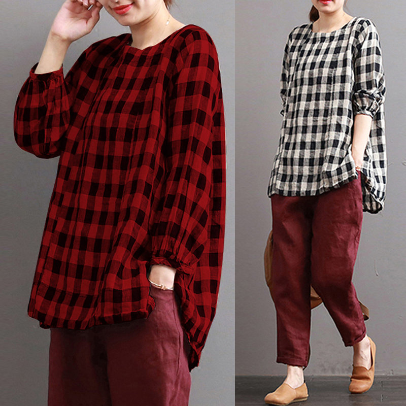 Women Check Plaid Long Sleeve Irregular Hem Loose Blouses