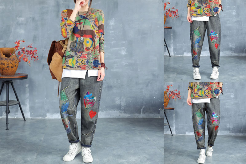 Vintage Embroidery Printed High Waist Loose Casual Jeans