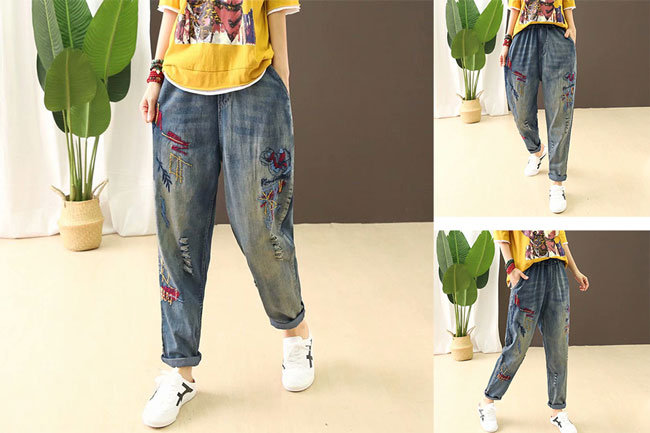Cartoon Embroidery Loose Harlan Jeans For Women
