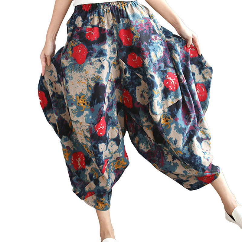 Leisure Loose Folk Print Pocket Harem Women Pants