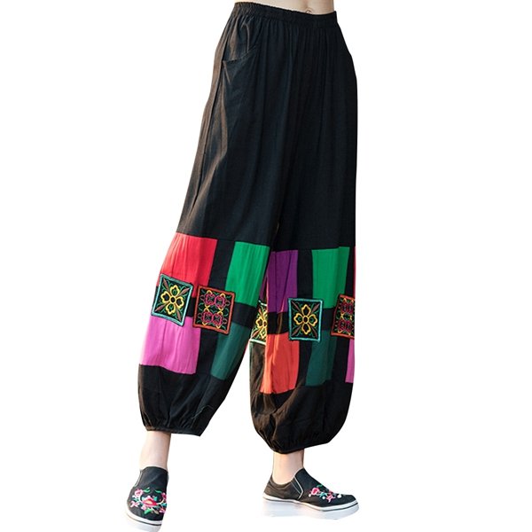 Folk Style Geometric Print Embroidered Patchwork Elastic Women Pants