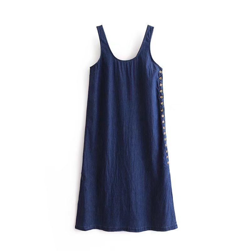 Denim Pure Color Side Buttons Splited Sleeveless Casual Dresses