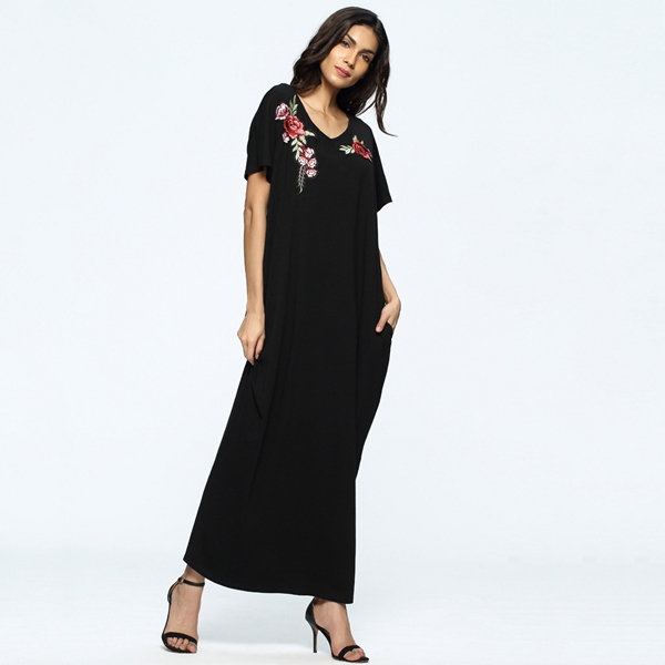 Floral Embroidered Loose Short Sleeve V-neck Maxi Dress For Women
