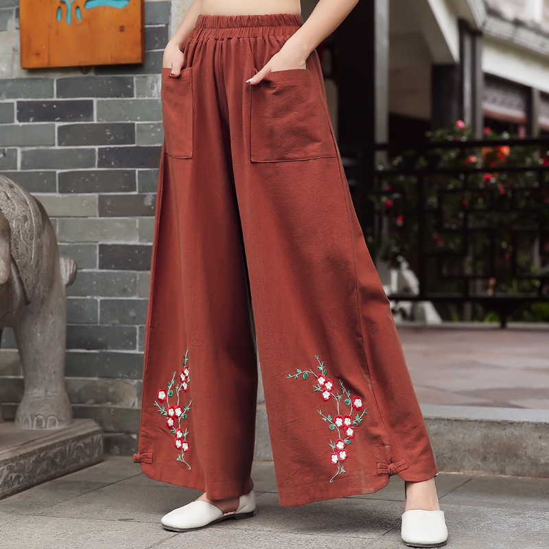 Vintage Ethnic Style Solid Color Embroidered Wide-leg Pants