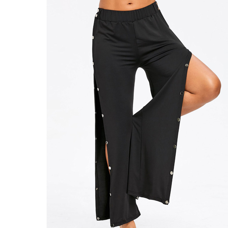 Casual Side Button Splited Pure Color Elastic Waist Pants