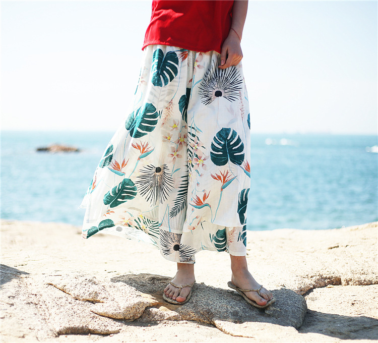 Leaves Print Layered Irregular Loose Elastic Waist Vintage Pants