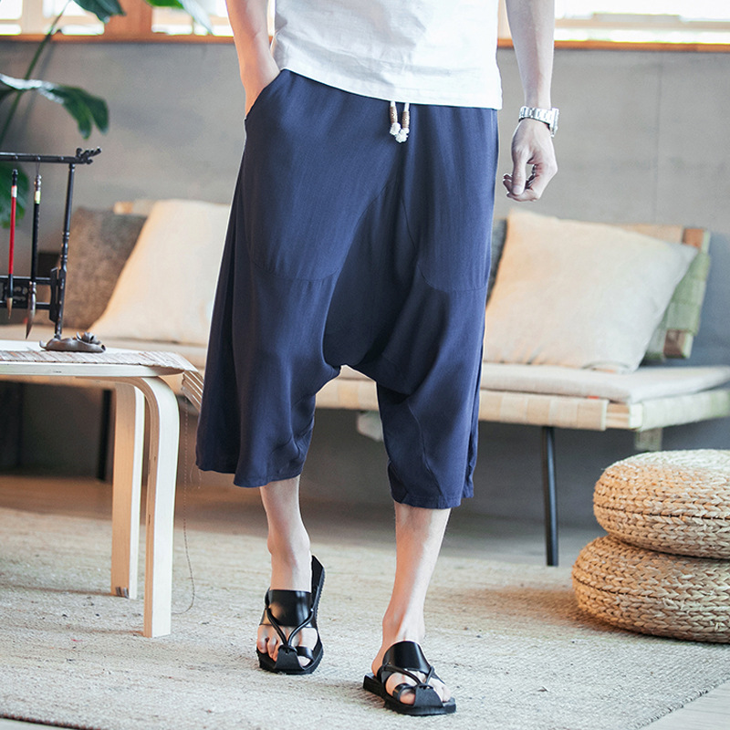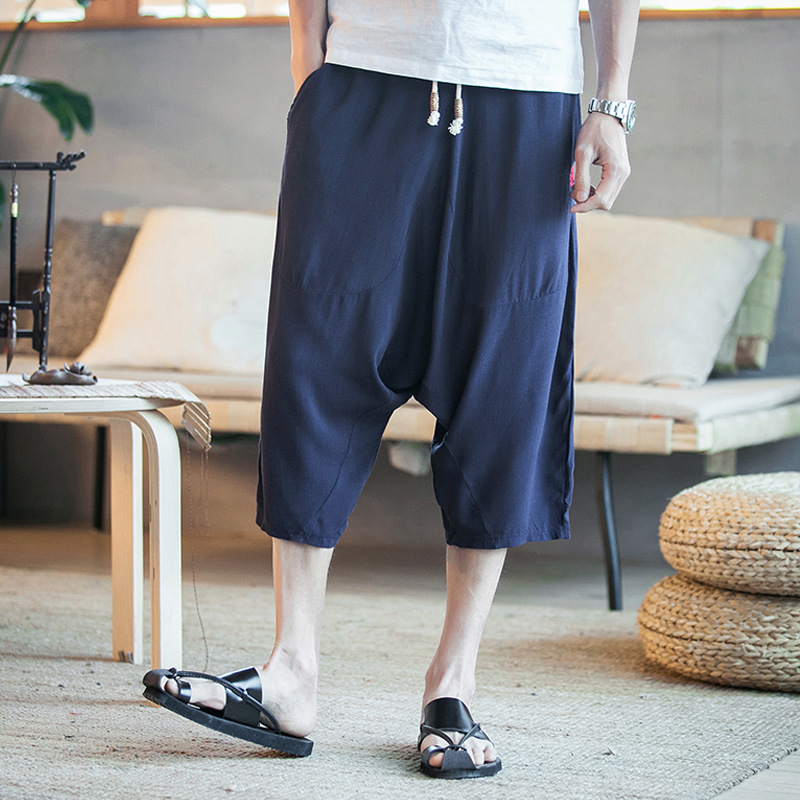 Men's Casual Cotton Linen Loose Pants Elastic Waist Knee Length Pants