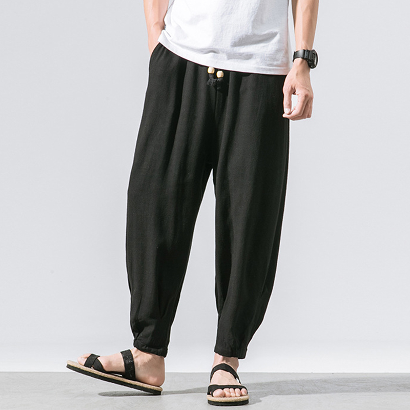 Mens Thin Linen Breathable Solid Color Loose Drawstring Casual Harem Pants