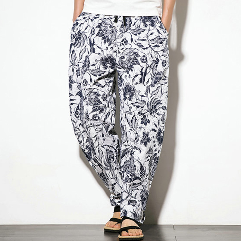Mens Summer Ethnic Style Printed Baggy Loose Drawstring Breathable 100%Cotton Casual Pants