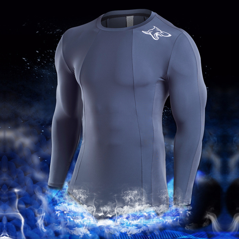 Mens Shark Printed Irregular Hem Quick-drying Tops Breathable Sports Tights Long Sleeve T Shirt