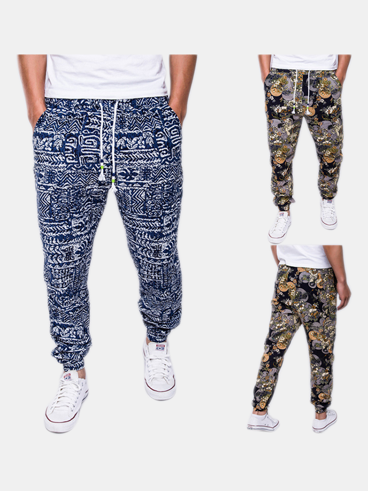 Mens Ethnic Style Printed Drawstring Elastic Waist Slim Fit Casual Fitness Running Pants