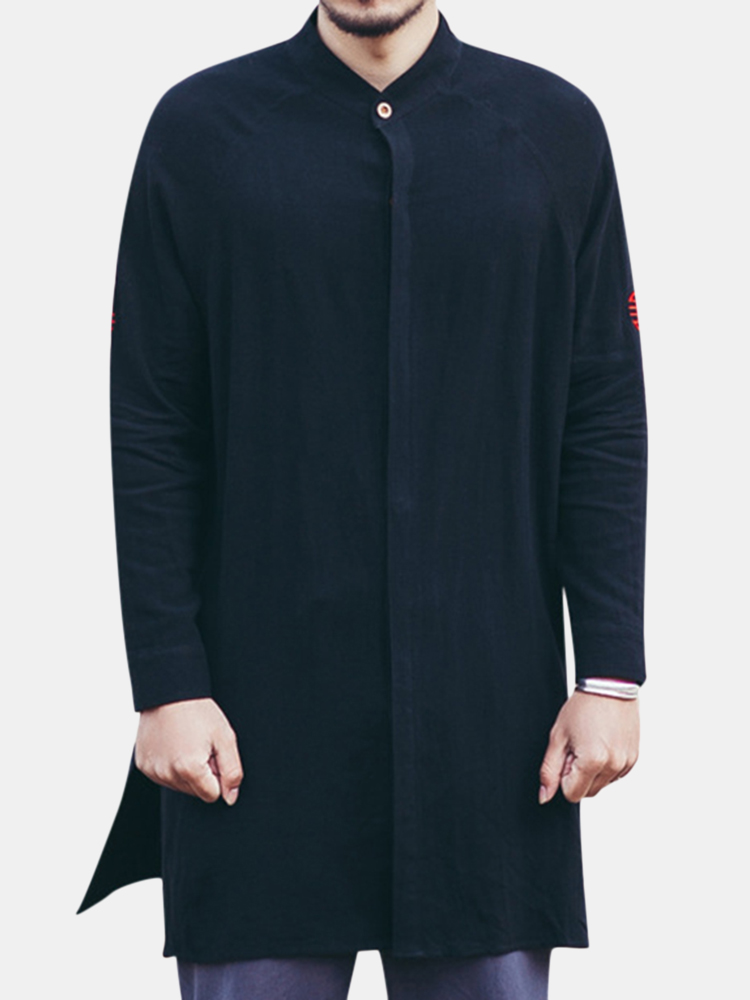 Mens Solid Color Single-breasted Mid Long Linen Loose Vintage Casual Jacket