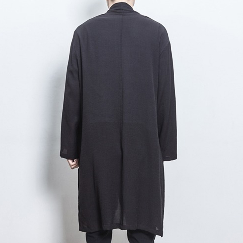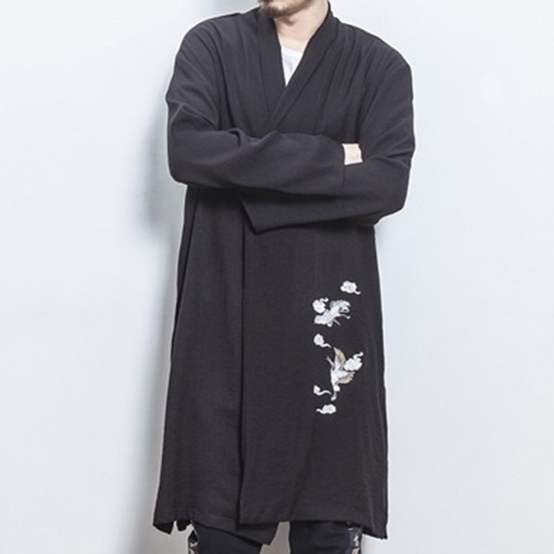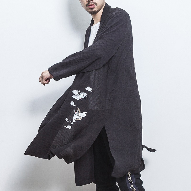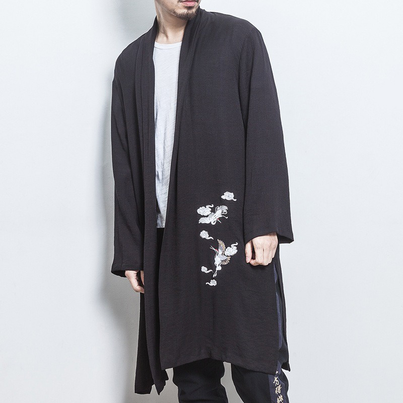Mens Mid-long Crane Embroidered National Style Long Sleeve Open Up Black Casual Jacket