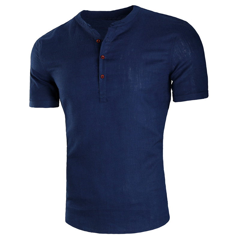 Mens Button Design T Shirts Stand Collar Solid Color Short Sleeve Casual Linen Tops