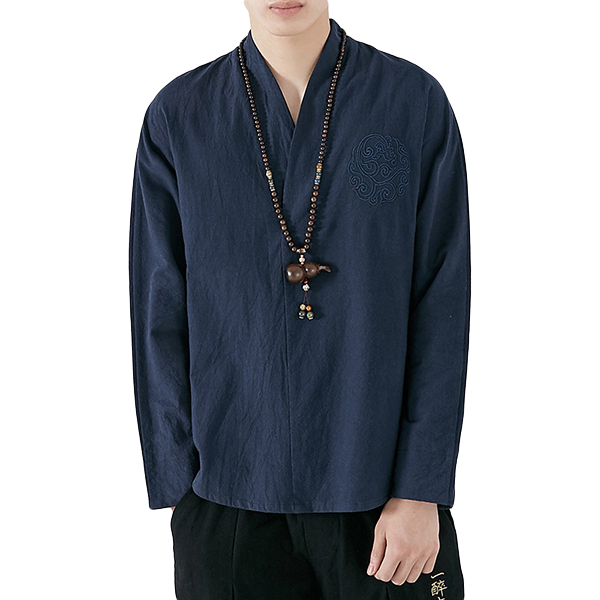 Mens Chinese Style Embroidery V-Neck Cotton T Shirts Casual Solid Color Long Sleeve Loose Tee Tops