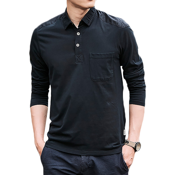 Mens Fall Brief Solid Color Turn-down Collar Long Sleeve Casual Polo Shirt
