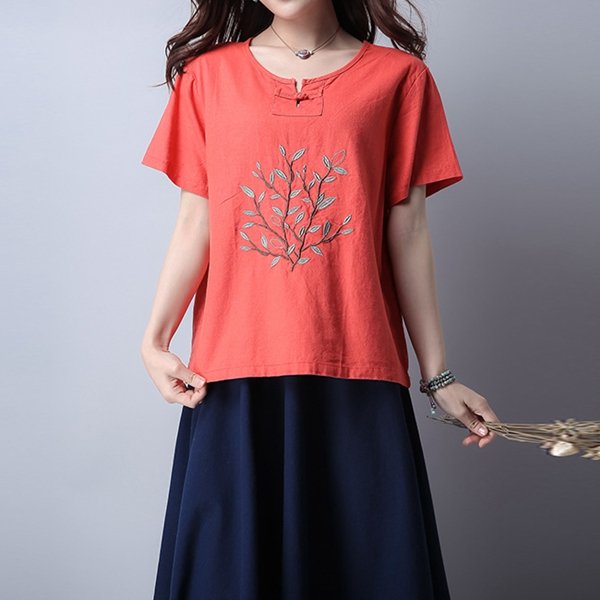 Casual Embroidered Frog Button Short Sleeve O-neck T-shirt For Women